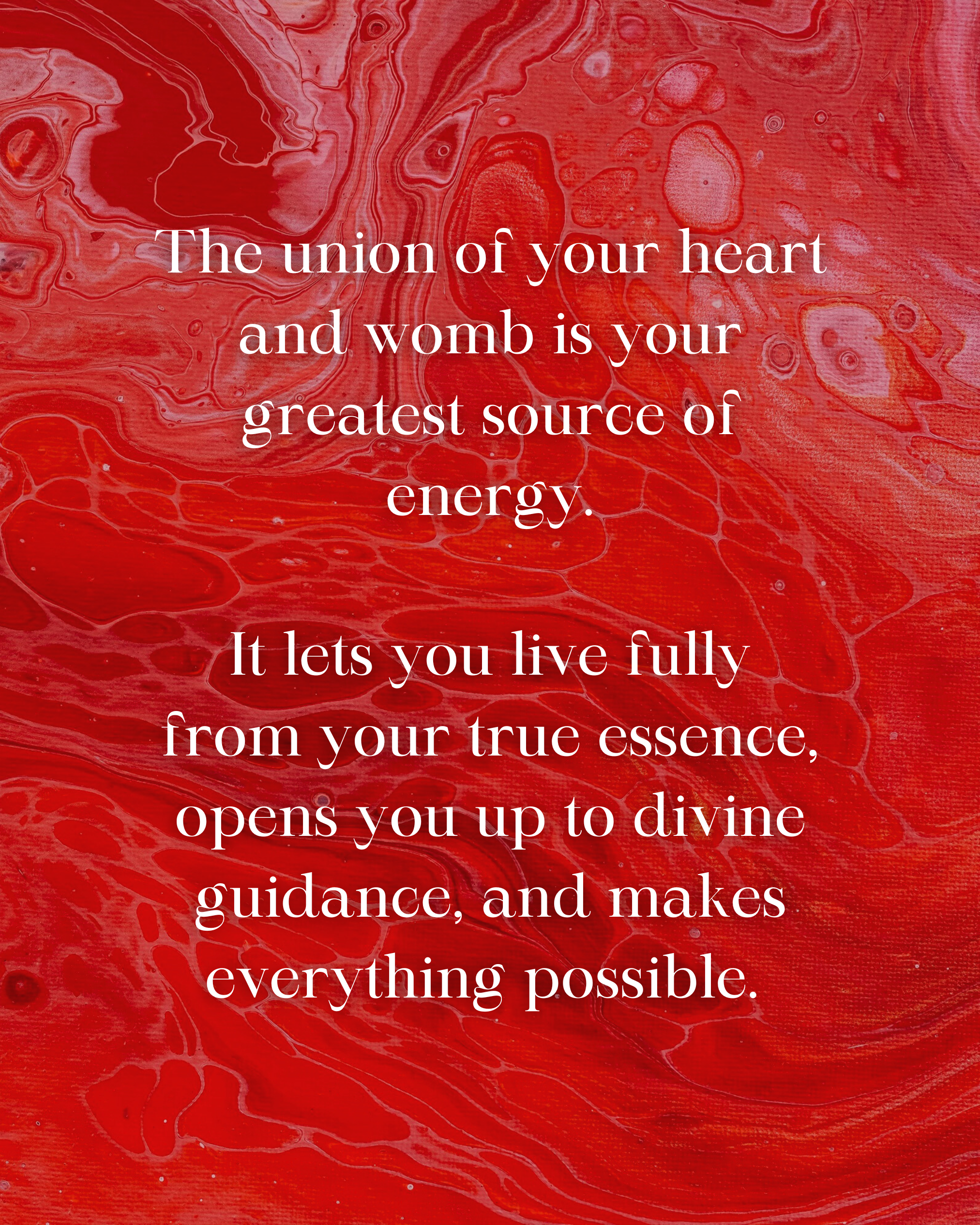 The union of your heart and womb is your greatest source of energy. It lets you live fully from your true essence, opens you up to divine guidance, and makes everything possible. We were made to love and be loved—to thrive, create, enjoy, inspire, and be inspired, and to celebrate creation